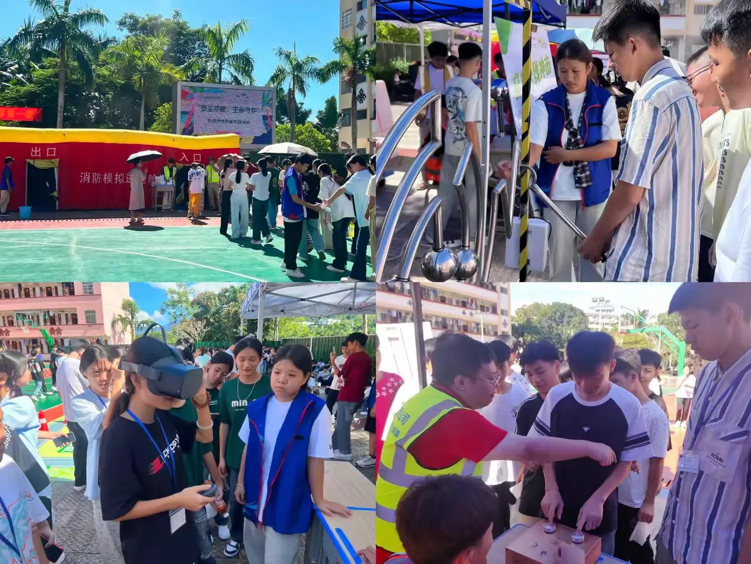 随后,学生分组进入安全体验区,亲身体验火灾模拟逃生、触电与静电观测、趣味“穿越火线”及VR安全模拟等项目。通过沉浸式、互动式的学习,同学们在模拟真实场景中掌握了应急避险与自救互救能力,进一步强化了安全意识。