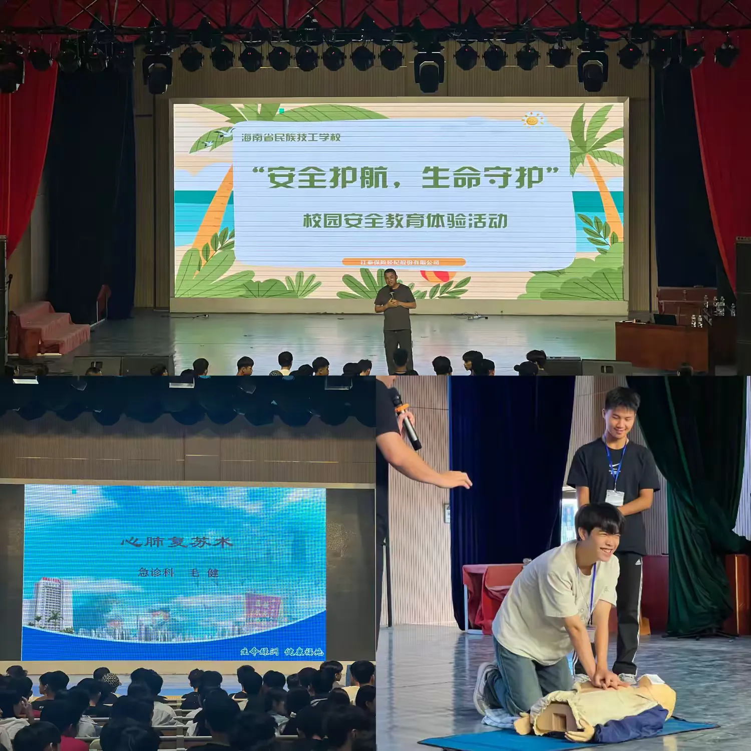 学校联合江泰保险经纪股份有限公司组织了“安全护航,生命守护”校园安全教育体验活动。活动首先在大礼堂开展急救知识培训,专业讲师现场演示溺水急救、心肺复苏、AED使用及海姆立克急救法等关键技能,同学们积极参与实操演练。